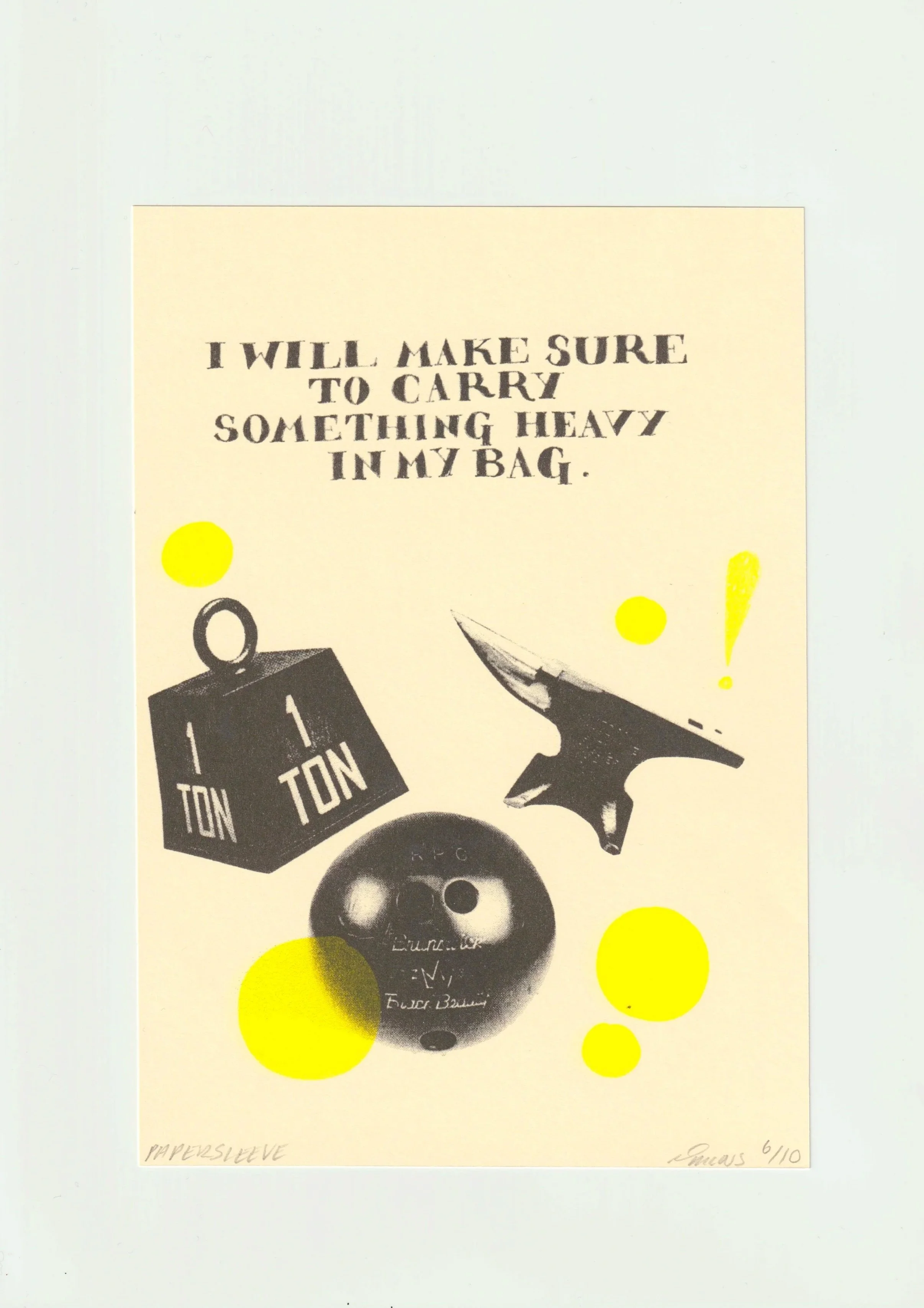 Categories: SHOP A3 PRINTS BAR RULES SHOP / I WON'T GET TOO DRUNK £20.00 I WILL STAY WITH MY FRIENDS £20.00 I WILL MAKE SURE THAT SOMEONE KNOWS WHERE I AM £20.00 I WILL REMEMBER MY KEYS £20.00 I WILL NEVER WALK HOME ALONE £20.00 I WILL NEVER GO OUT ALONE £20.00 I WILL MAKE SURE MY PHONE IS CHARGED £20.00 I WILL KEEP A CLOSE EYE ON MY DRINK £20.00 I WON'T TALK TO STRANGERS £20.00 I WILL KEEP MY WITS ABOUT ME £20.00 I WILL CHECK ON MY FRIENDS IN THE SMOKING AREA £20.00 I WILL CHECK THAT MY FRIENDS GOT HOME SAFE £20.00 I WILL CARRY SOMETHING HEAVY £20.00 I WILL BE AWARE OF MY SURROUNDINGS £20.00 I WILL ALWAYS SHARE A TAXI £20.00 I WILL SHOUT AT CREEPS £20.00